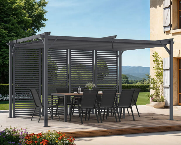Las pérgolas de aluminio combinan ligereza, resistencia y mínimo mantenimiento, lo que las convierte en una de las opciones más prácticas del mercado. El aluminio es naturalmente resistente a la corrosión, por lo que no se oxida con la lluvia o la sal marina — una ventaja clave en zonas costeras o de clima húmedo. Además, su bajo peso facilita la instalación y reduce la necesidad de cimientos o soportes muy robustos. Estéticamente, el aluminio es muy flexible: puede anodizarse o pintarse en una amplia gama de colores, adaptándose a estilos contemporáneos o más clásicos.
